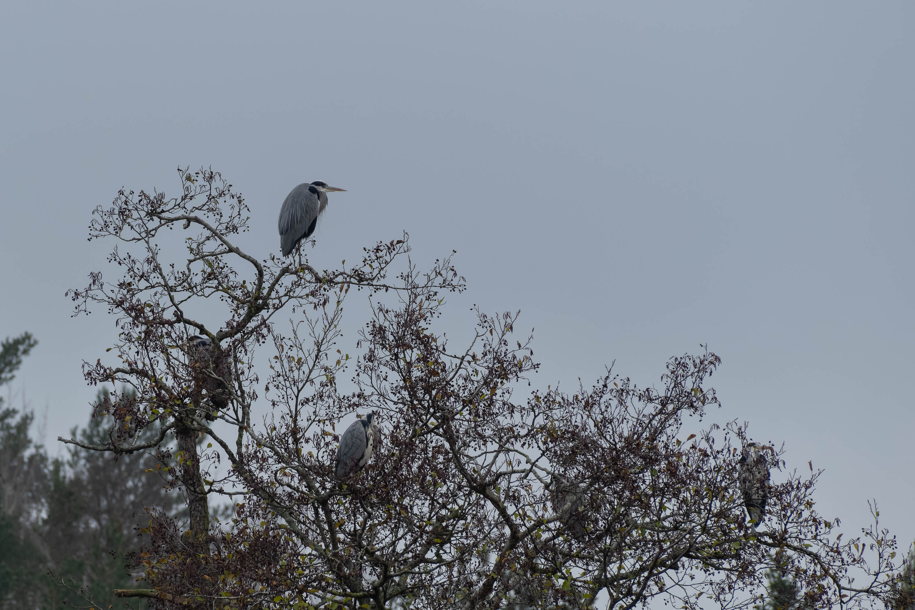 Hägrar i trädtopparna runt Isbladskärret en mycket grå novemberdag.