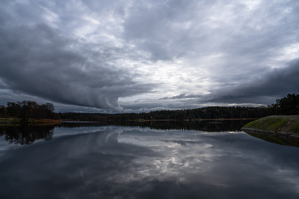 Gillade speglingarna i vattnet samt molnens form till vänster.