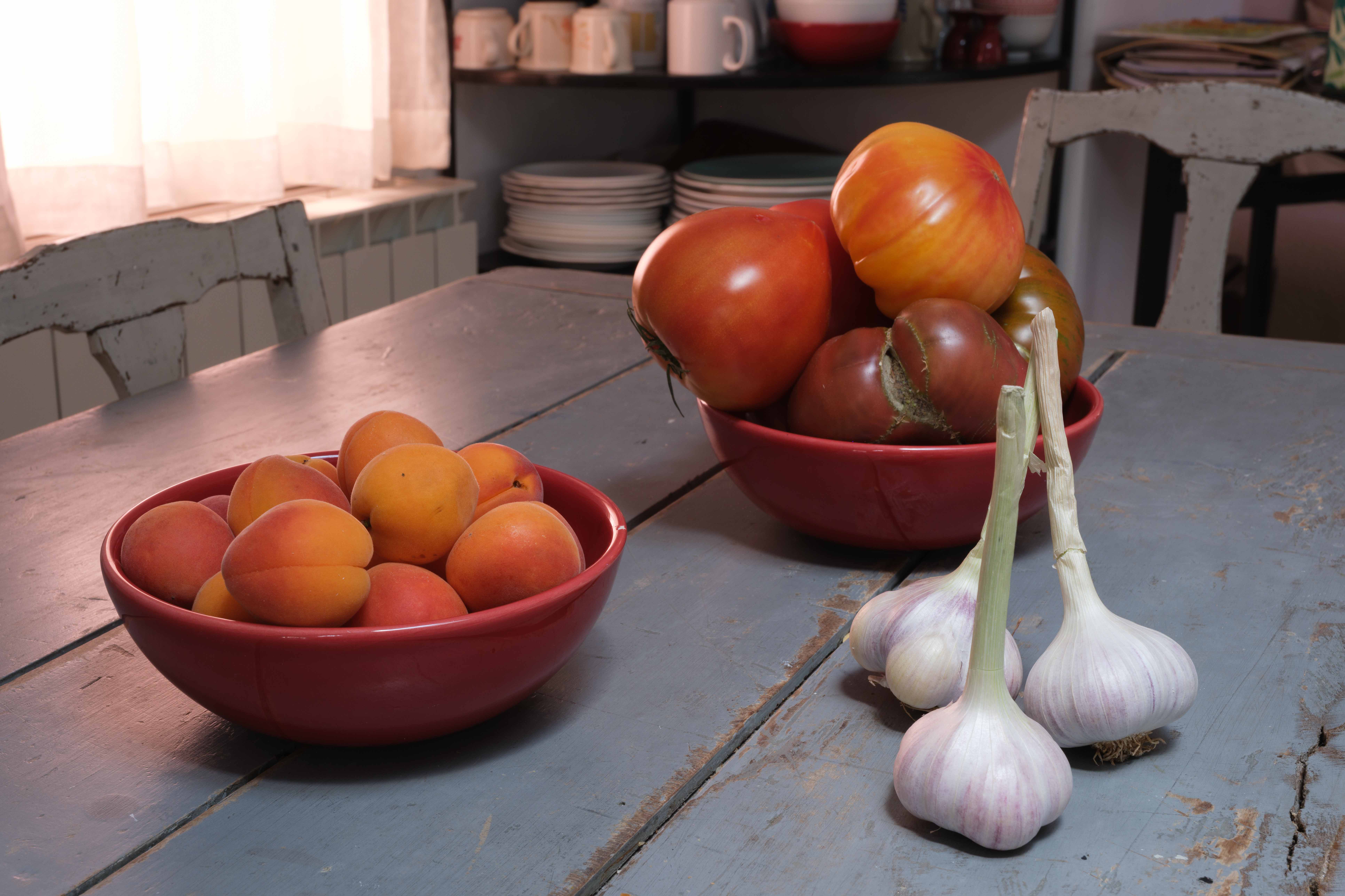 Aprikoser, tomater och vitlök på köksbordet i huset vi hyrde i Roussillon. Vackert ljus från takfönster mitt på dagen.
